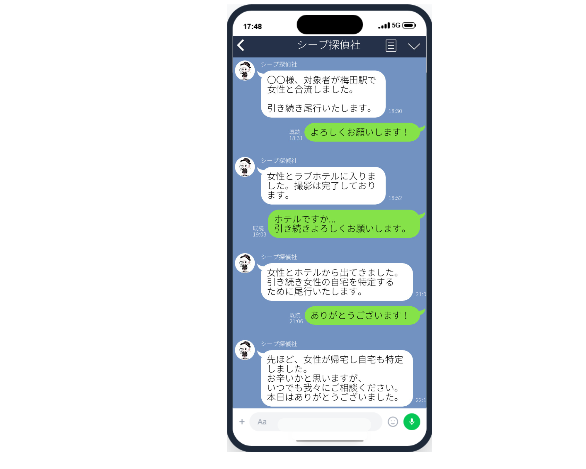 調査当日はご依頼者様にラインやメールなどで、現在の状況をご報告させていただいております。